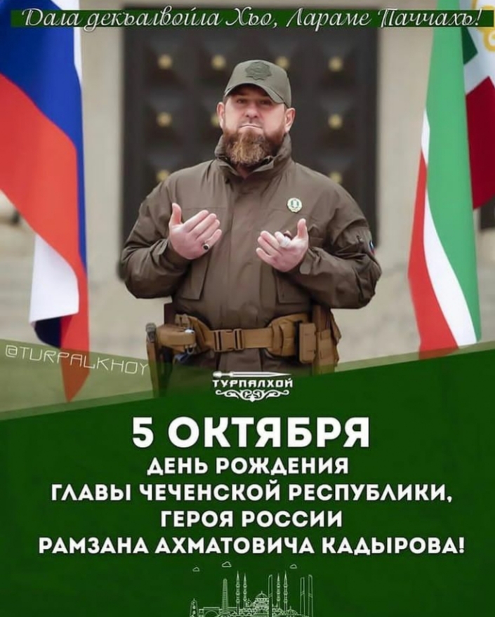 Уважаемый Рамзан Ахматович, примите искренние поздравления с Днём рождения, пожелания крепкого здоровья, счастья, бесконечных сил и энергии на продолжение верного служения интересам нашей великой Родины! Дала декъалвойла хьо винчу денца, Лераме МЕХК-ДА Рамзан!