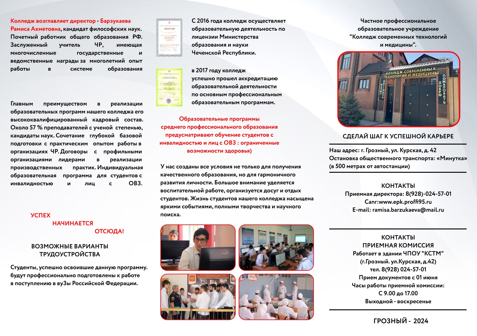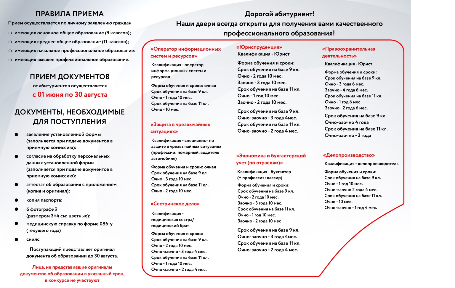 Добрый день! Колледж современных технологий и медицины планирует набор по специальностям и профессиям, указанным в буклете